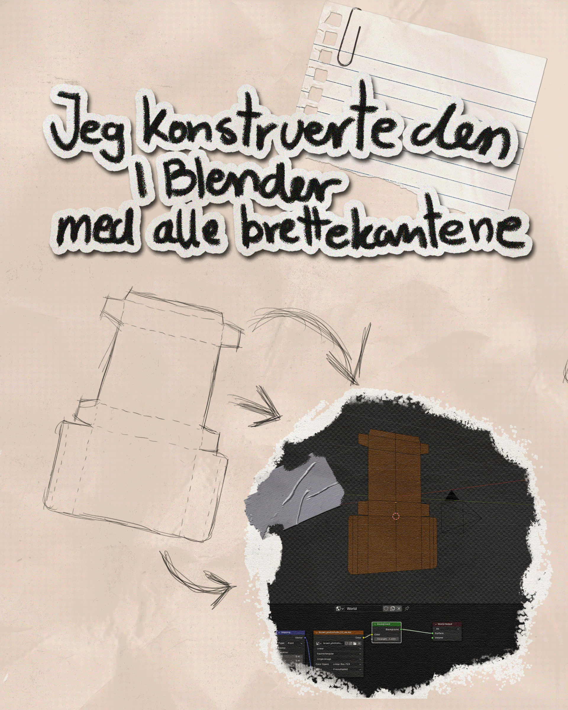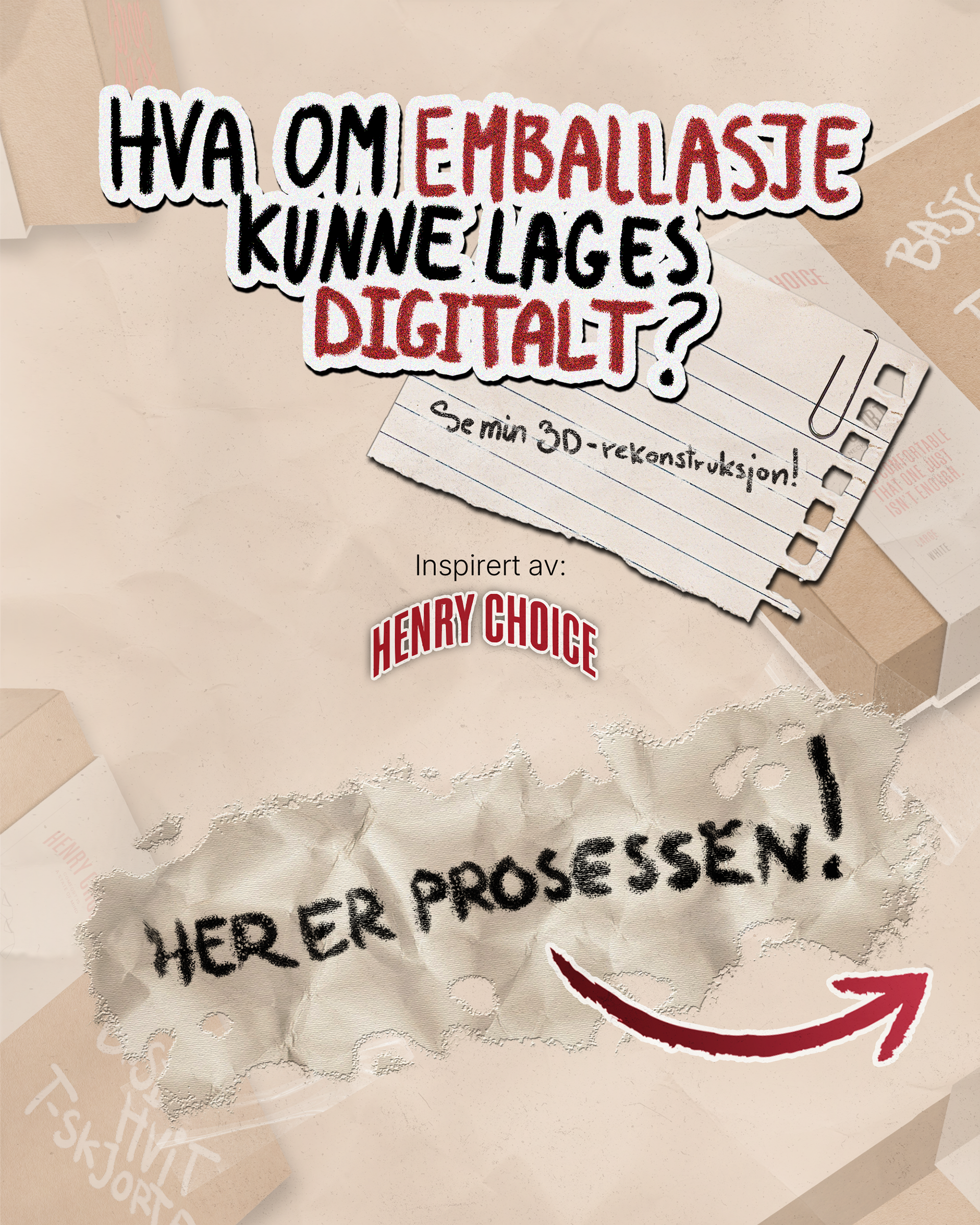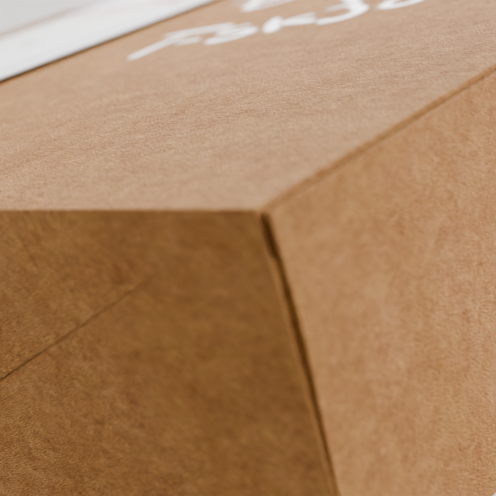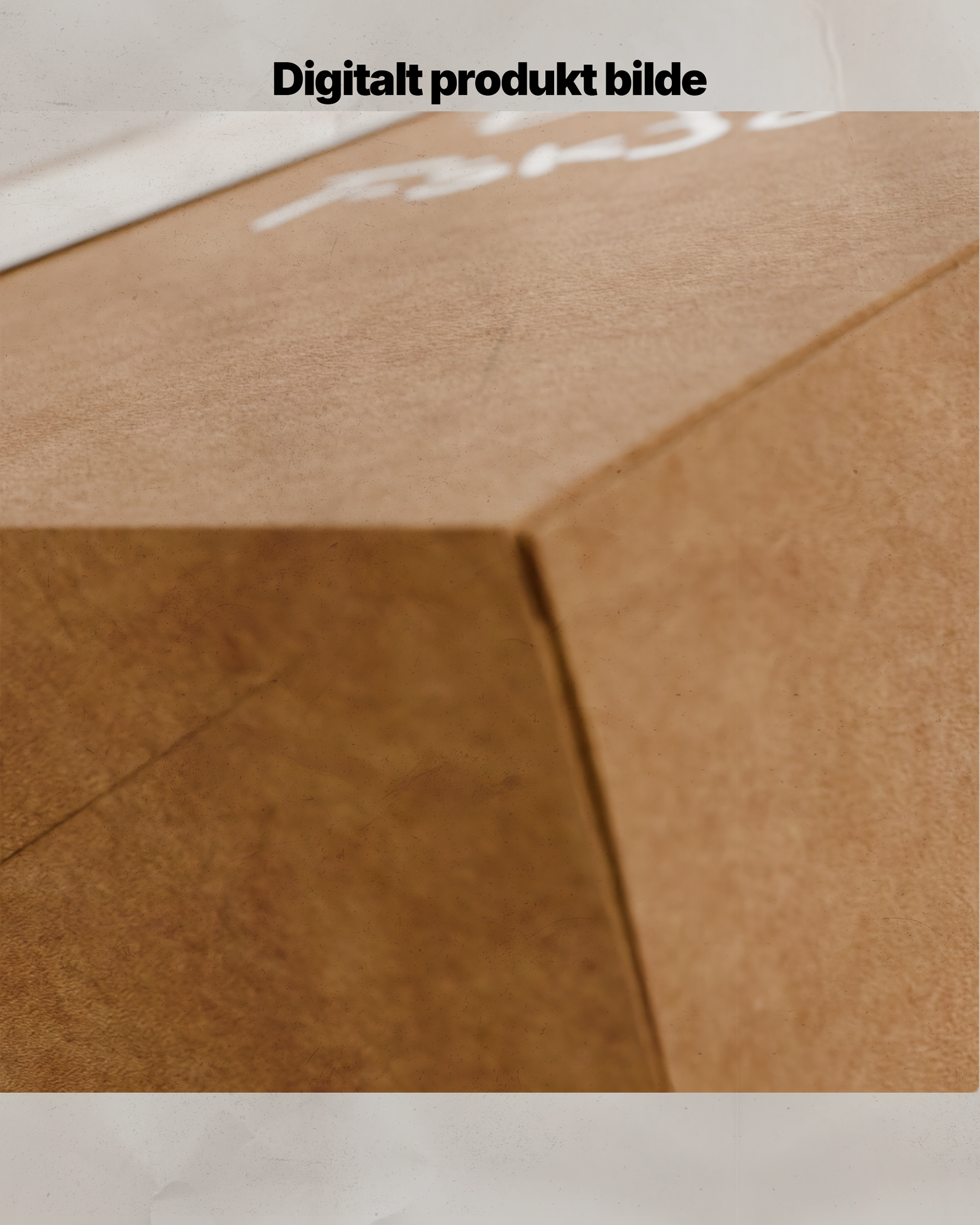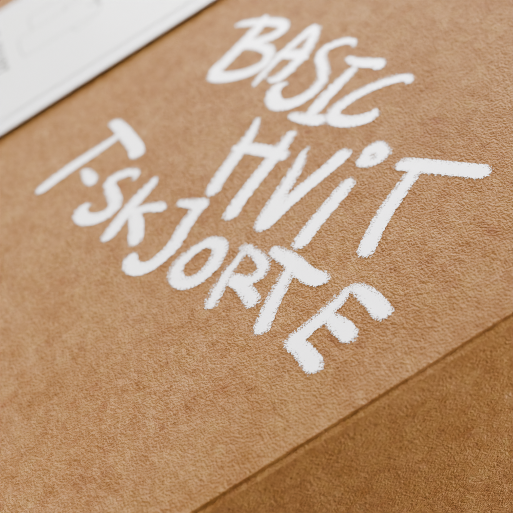 Med bildet som referanse gjenskapte jeg esken digitalt (se bilder nederst). Etter at selve esken var konstruert, jobbet jeg med å gjenskape overflatedetaljer som teksturen og materialfølelsen. Målet var å oppnå en realistisk "papp-look," inkludert den grove strukturen og den naturlige fargetonen til kartongmaterialet. Jeg utviklet også en troverdig tekstur for den hvite etiketten som omslutter esken.