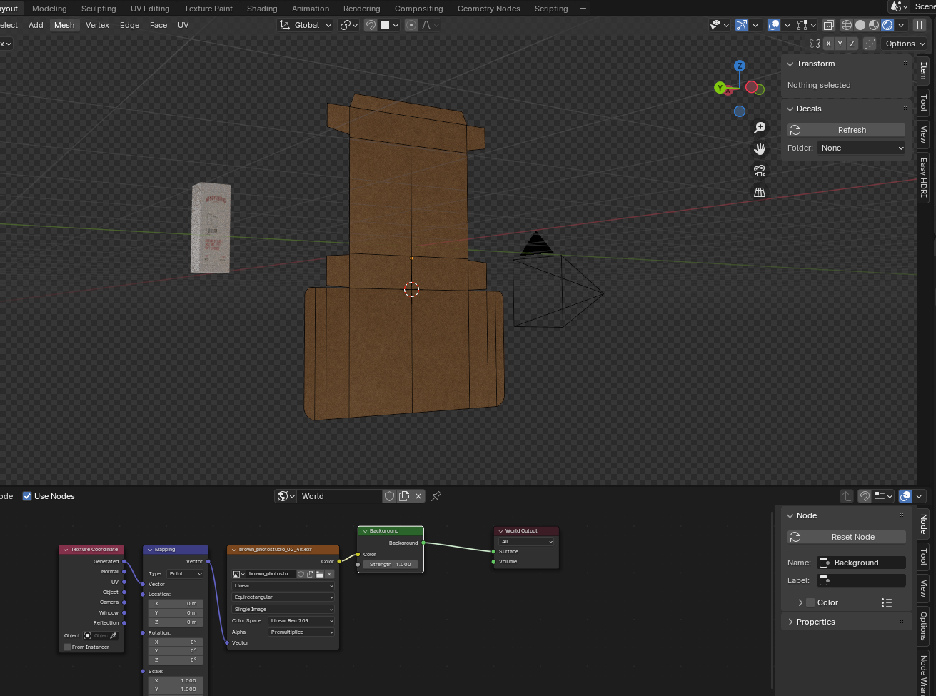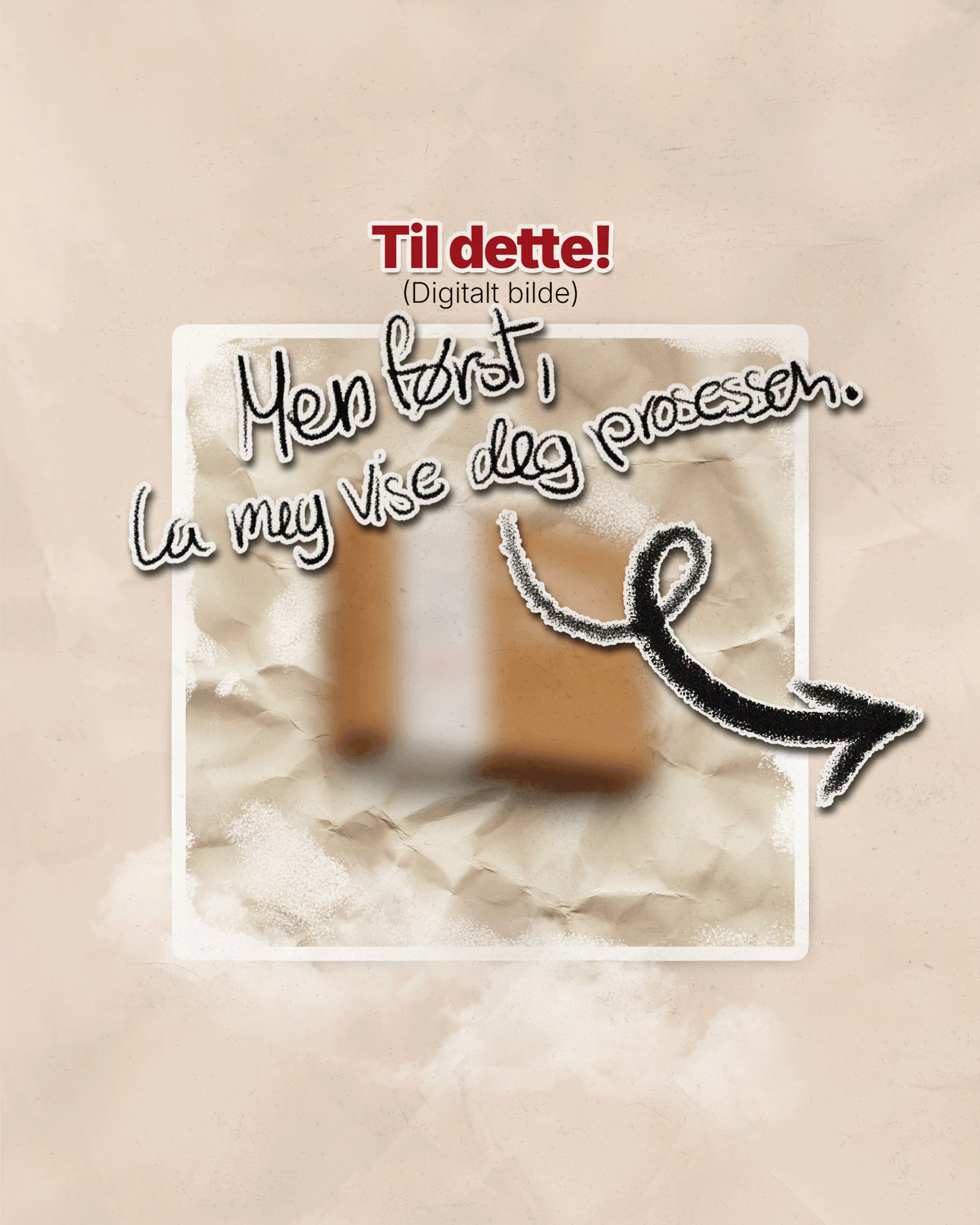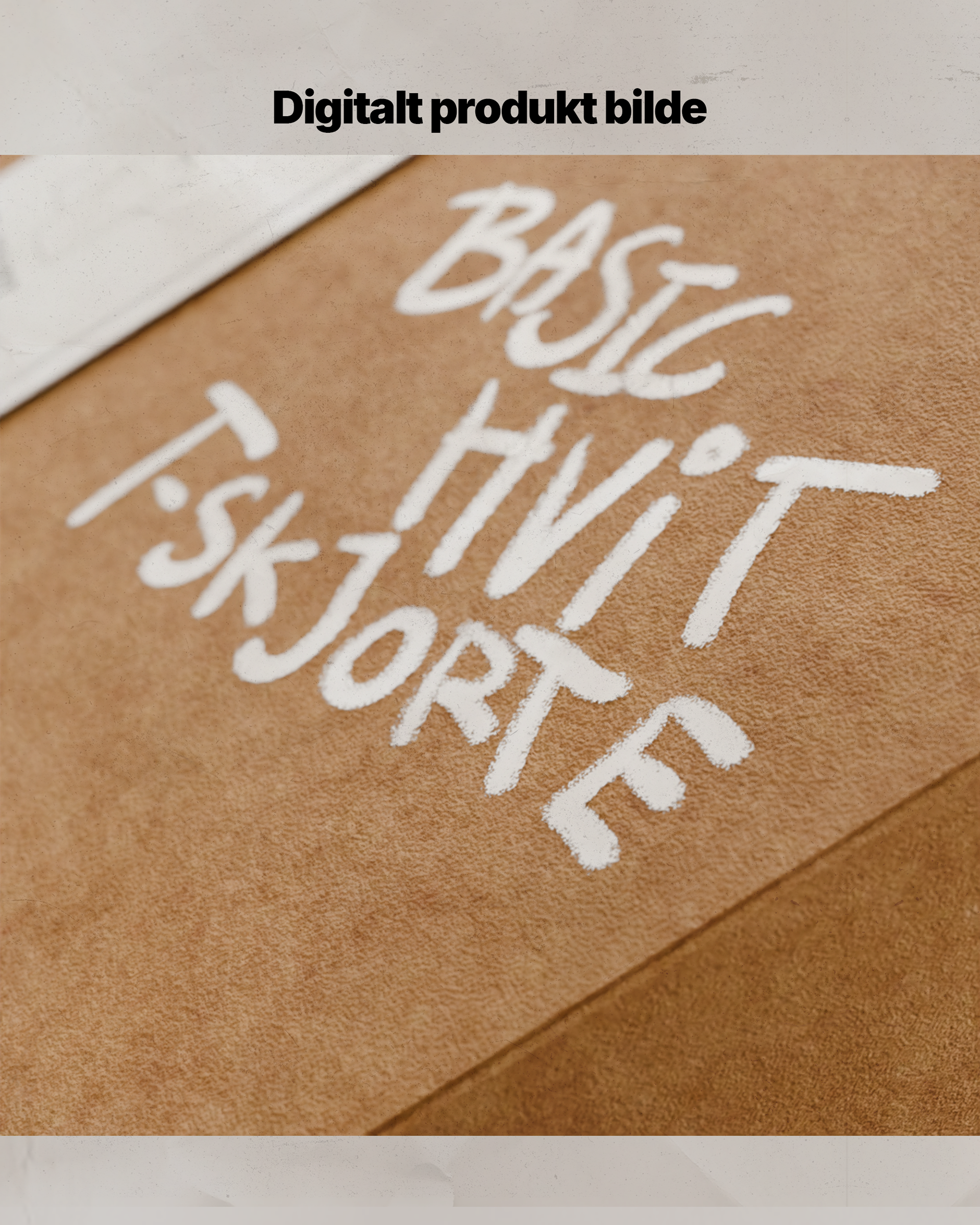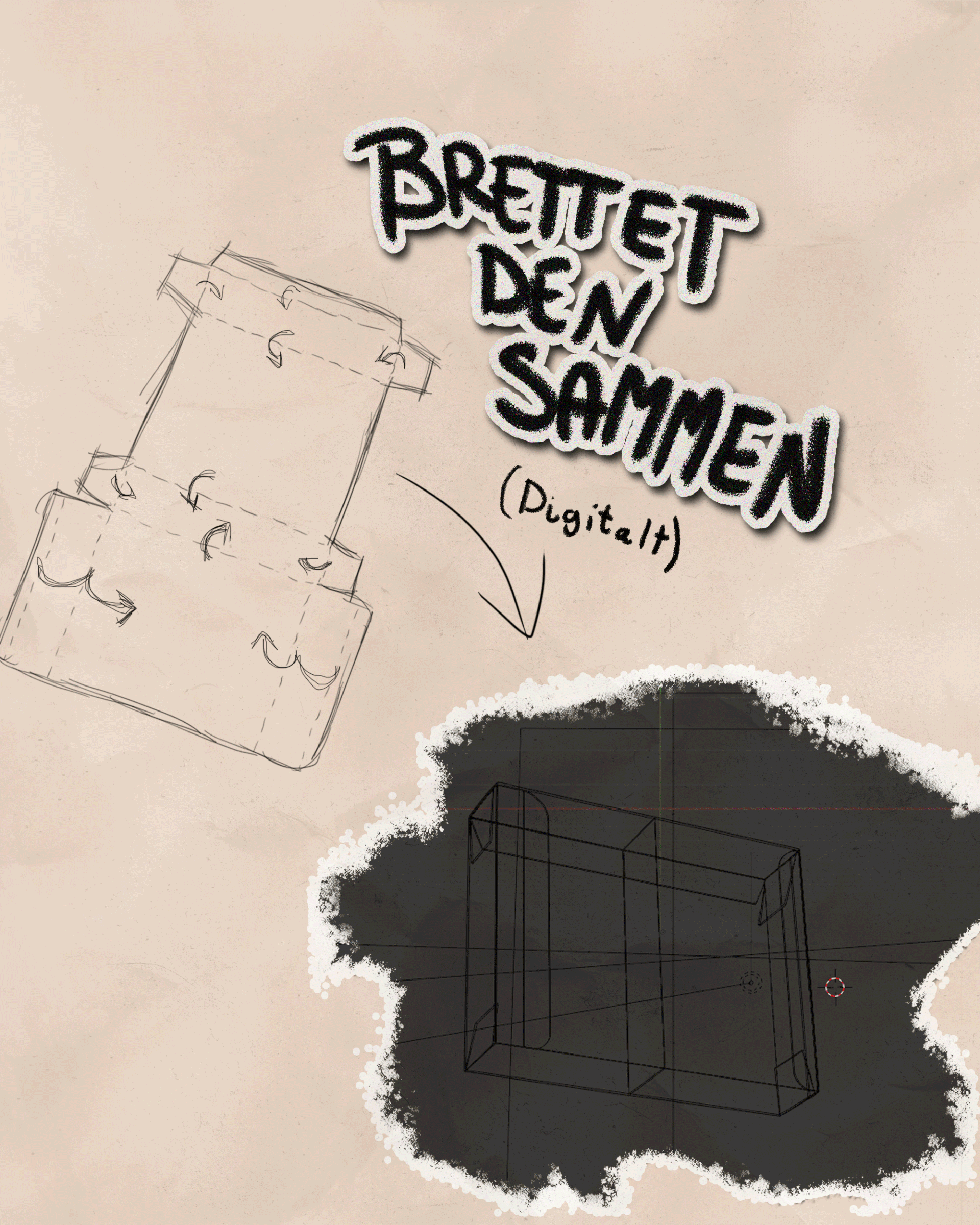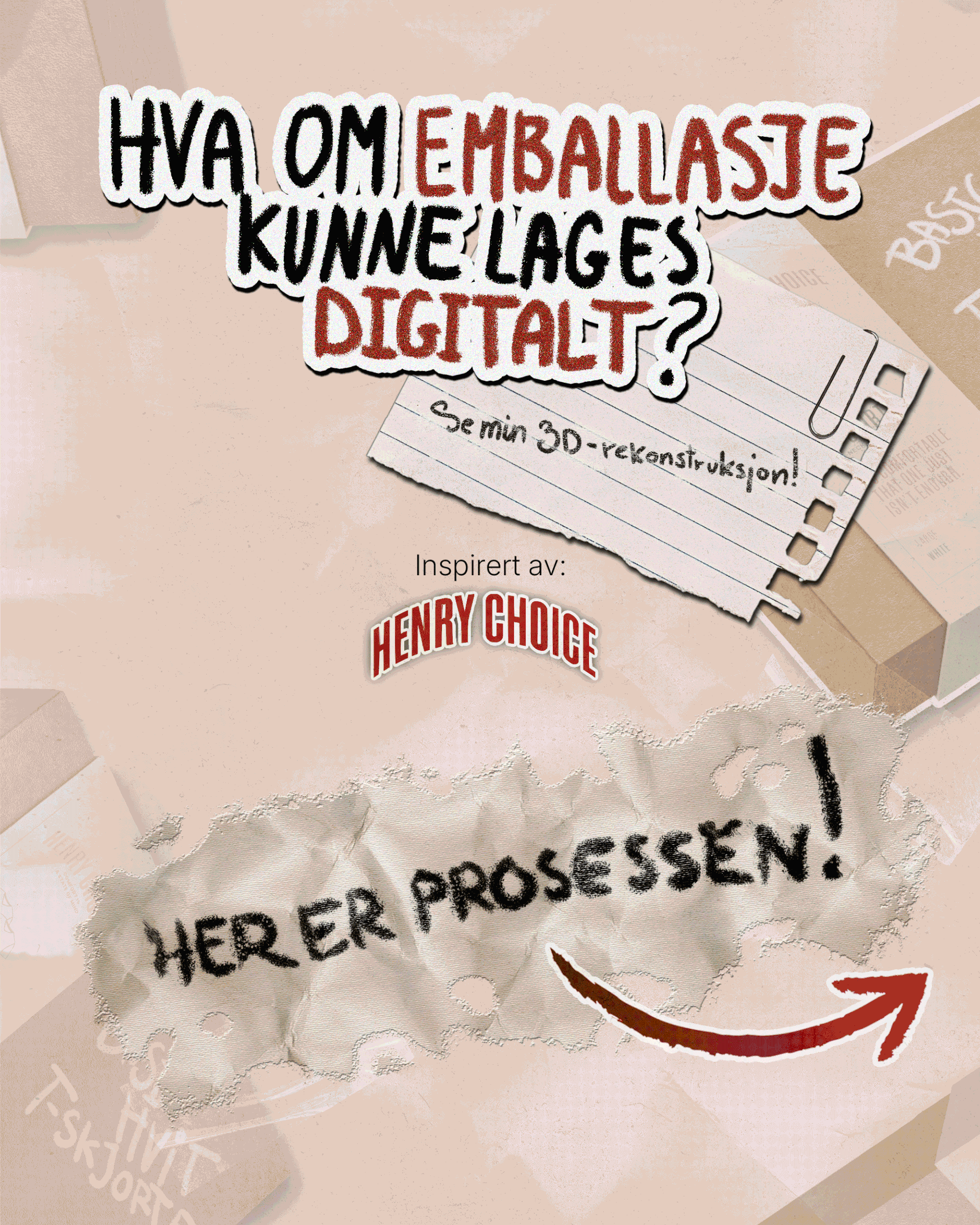 Med bildet som referanse gjenskapte jeg esken digitalt (se bilder nederst). Etter at selve esken var konstruert, jobbet jeg med å gjenskape overflatedetaljer som teksturen og materialfølelsen. Målet var å oppnå en realistisk "papp-look," inkludert den grove strukturen og den naturlige fargetonen til kartongmaterialet. Jeg utviklet også en troverdig tekstur for den hvite etiketten som omslutter esken.